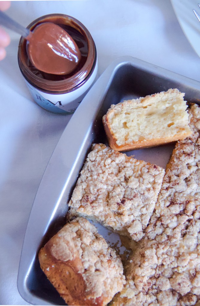 - Bake for 45-50 minutes, or until a toothpick inserted into the center comes out clean. Let it cool for ~30 minutes before cutting and serving. I like to drizzle more coffee butter on top!