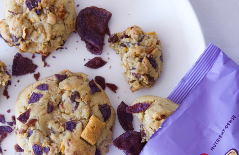 Kitchen Sink Cookies are soft, chewy cookies that are usually packed with chocolate chips, pretzels, potato chips, toffee, and more! Have leftover snacks and ingredients that you need to use? Well chuck them all into this cookie and they'll turn out delicious! I used Jackson Honest's Purple Heirloom Sweet Potato Chips, chocolate chips, Krave cereal,…